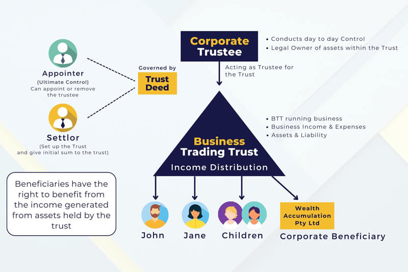 This trust structure is suitable for businesses with multiple partners or investors, as it provides fixed entitlements to the income and capital. The trustee owns the trust’s assets and must use them for the benefit of the unitholders engaged in trading activities. The Trust can last for up to 80 years, and the trustee maintains day-to-day control of the assets placed into the trust for trading purposes.