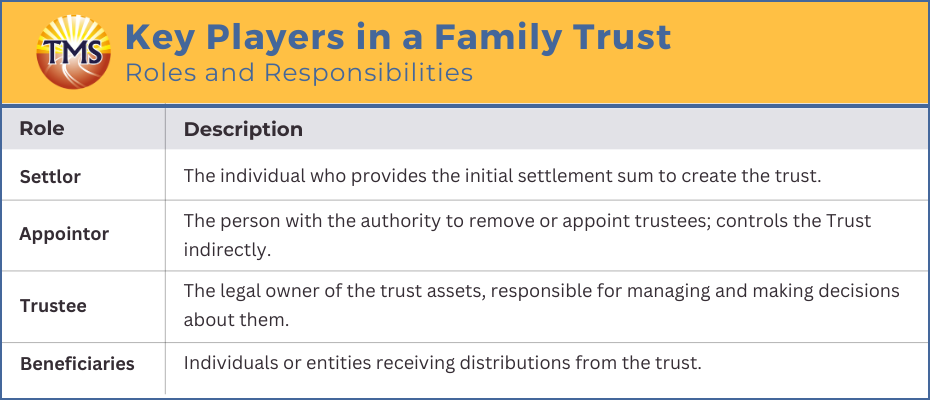 A family trust is a legal entity that is designed to securely manage, distribute, or invest assets for the benefit of specific family members or other designated beneficiaries. Within this framework, there are several key roles that contribute to the effective administration and management of the trust’s assets:
